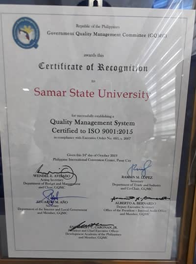 PASAY CITY – Samar State University (SSU) was given recognition by the Government Quality Management Committee (GQMC) for successfully establishing a Quality Management System Certified to ISO 9001:2015 in compliance with Executive Order No. 605, s. 2007.