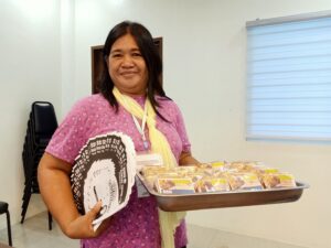 Barangay health workers Beatrice Albos and Jenetha Morena received 900 pieces of IEC materials to be distributed to the households of the said barangay. They also received banana cakes for frontliners.