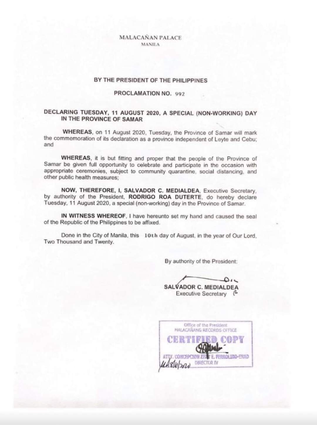 Pursuant to Proclamation No. 992 by the President of the Philippines, August 11, 2020 (Tuesday) is a Special Non-Working Day in the Province of Samar.
