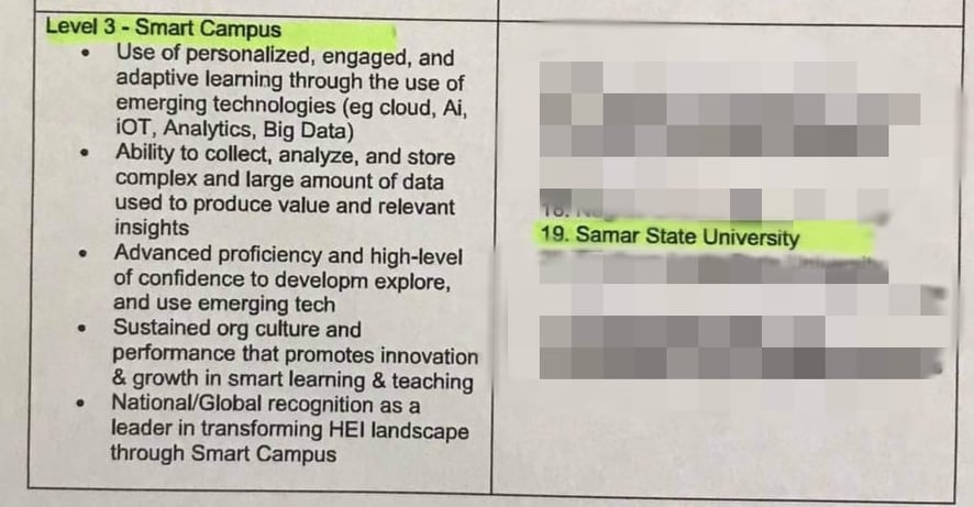 CATBALOGAN CITY – In the OCAS Memorandum released to the Presidents of State Universities and Colleges under the Office of the Commission on Higher Education (CHED) Commissioner Aldrin A. Darilag, Samar State University landed on the highest classification of Campuses, Level 3 Smart Campus.