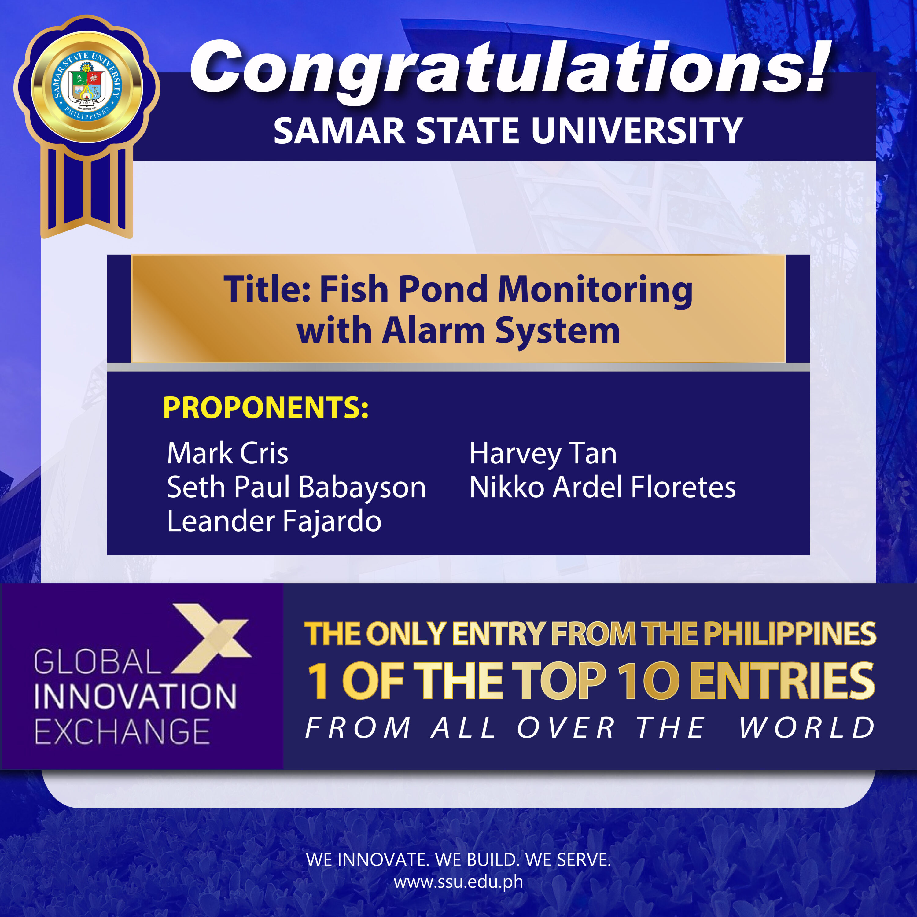 CATBALOGAN CITY─ Samar State University’s entry titled “Fish Pond Monitoring with Alarm System” is still in the game being one of the Top 10 entries from all over the world that was shortlisted in the 2023 GIX Innovation Competition.