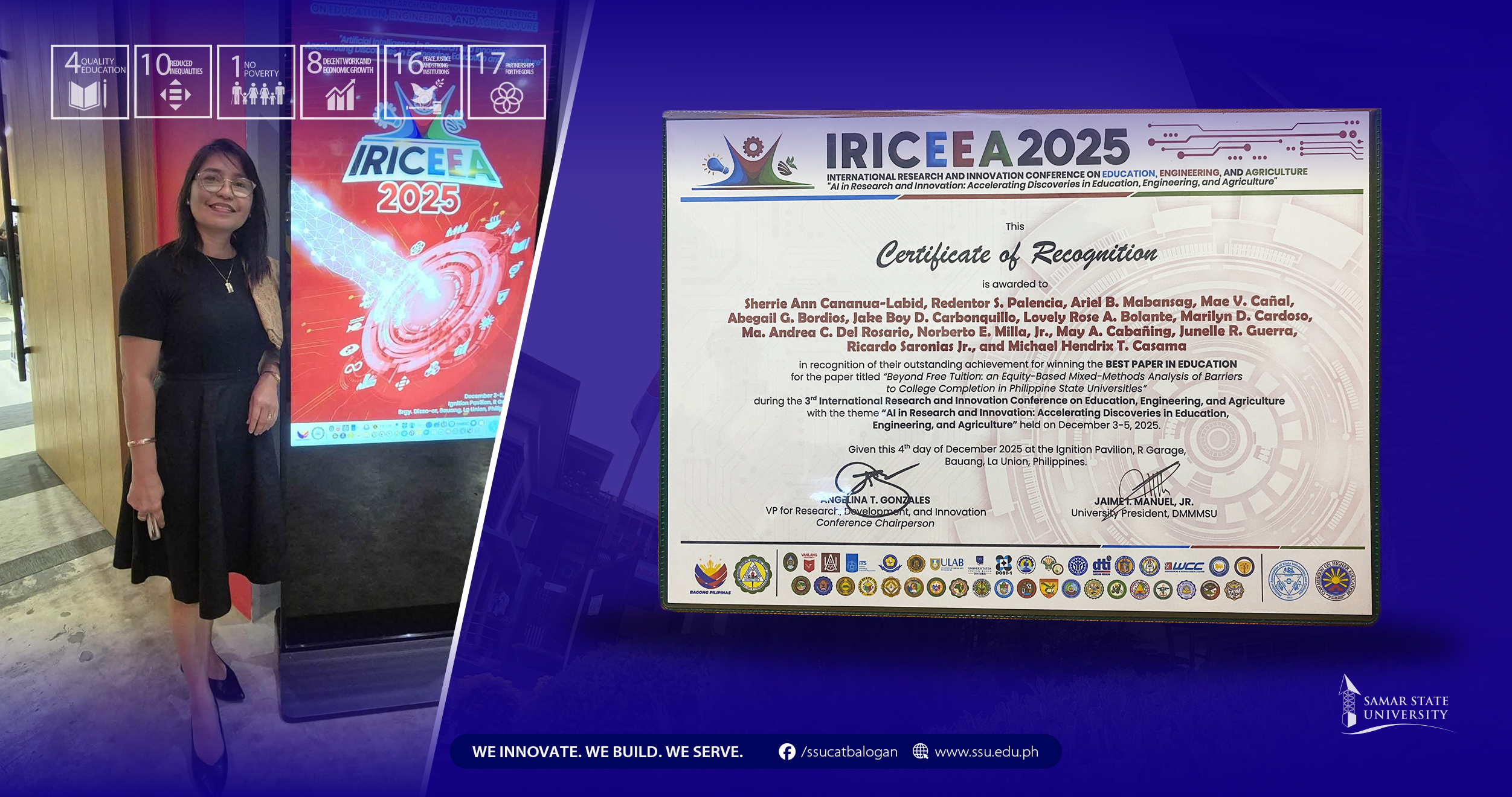 La Union, PHILIPPINES—Samar State University (SSU) proudly celebrates another landmark achievement as COED Prof. Dr. Sherrie Ann C. Labid, Research Executive Director, secured both the Best Paper in Education (Human Capital and Impact Track) and the Overall Best Paper in Education Award during the 3rd International Research and Innovation Conference on Education, Engineering, and Agriculture, held on December 3–5, 2025, in Bauang, La Union, Philippines.