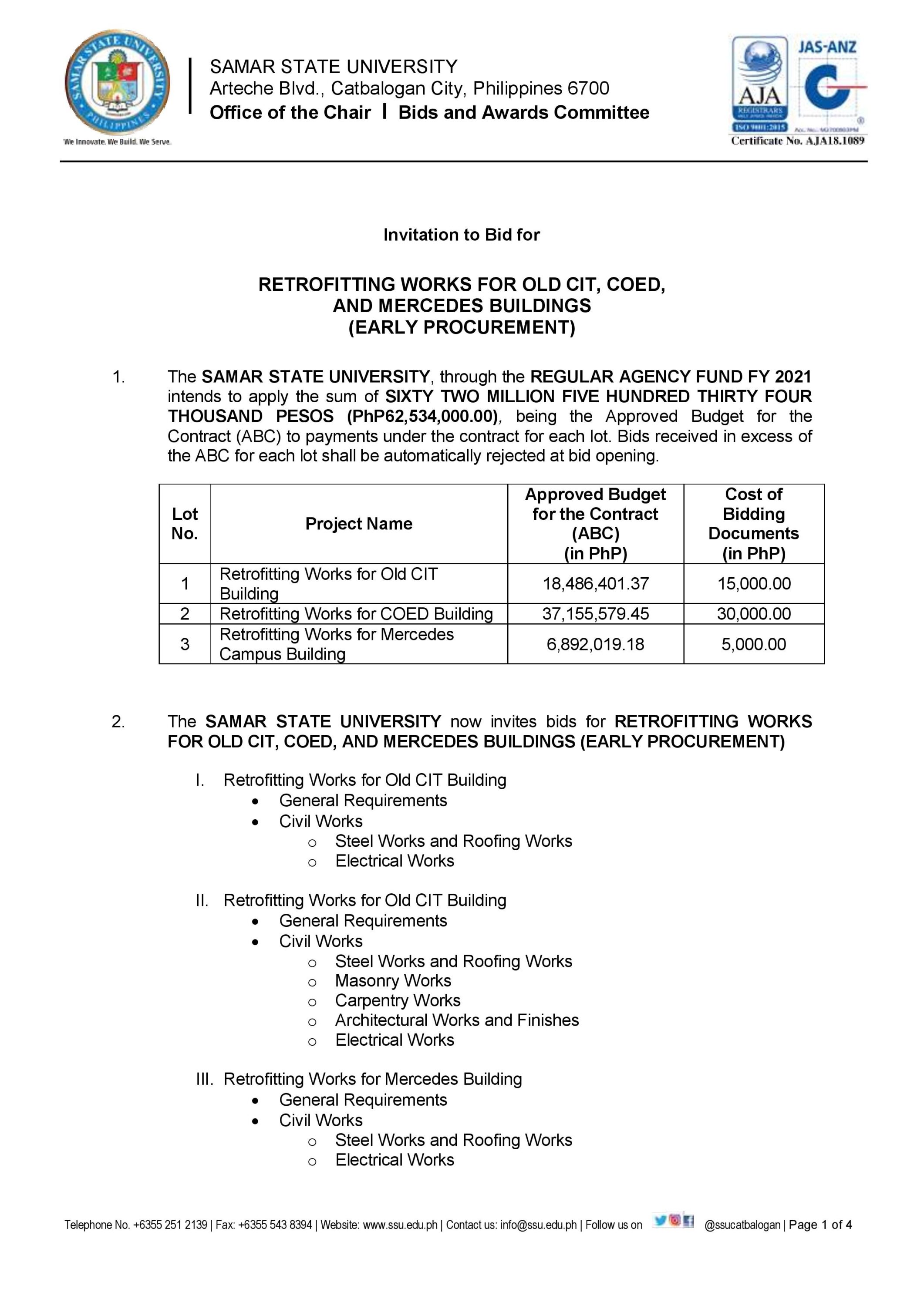 RETROFITTING WORKS FOR OLD CIT, COED, AND MERCEDES BUILDINGS (EARLY PROCUREMENT) Leave a Comment / Bids Notices / Aileen Manicani RETROFITTING WORKS FOR OLD CIT, COED, AND MERCEDES BUILDINGS (EARLY PROCUREMENT) Read More »