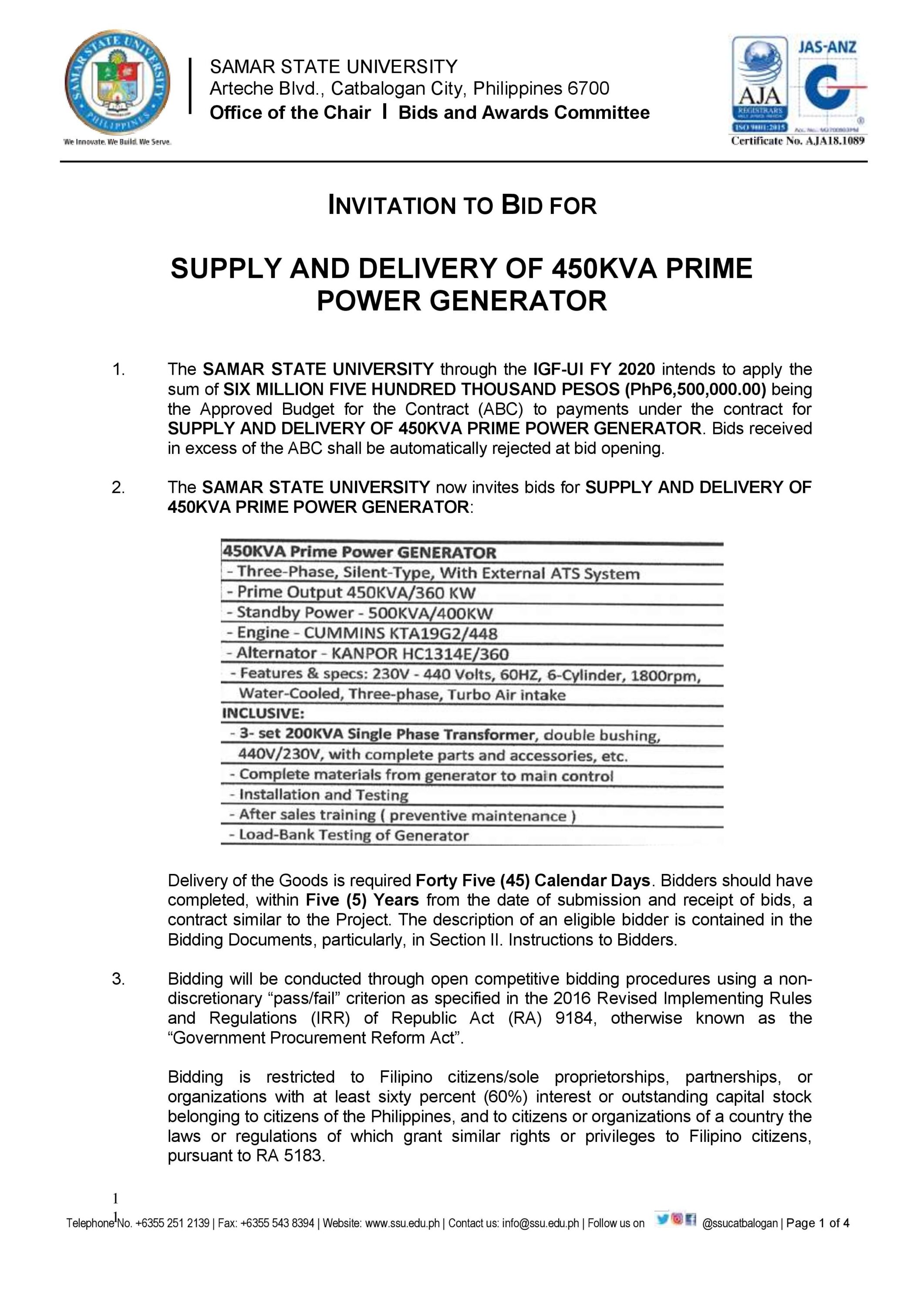 SUPPLY AND DELIVERY OF 450KVA PRIME POWER GENERATOR Leave a Comment / Bids Notices / Aileen Manicani SUPPLY AND DELIVERY OF 450KVA PRIME POWER GENERATOR Read More »
