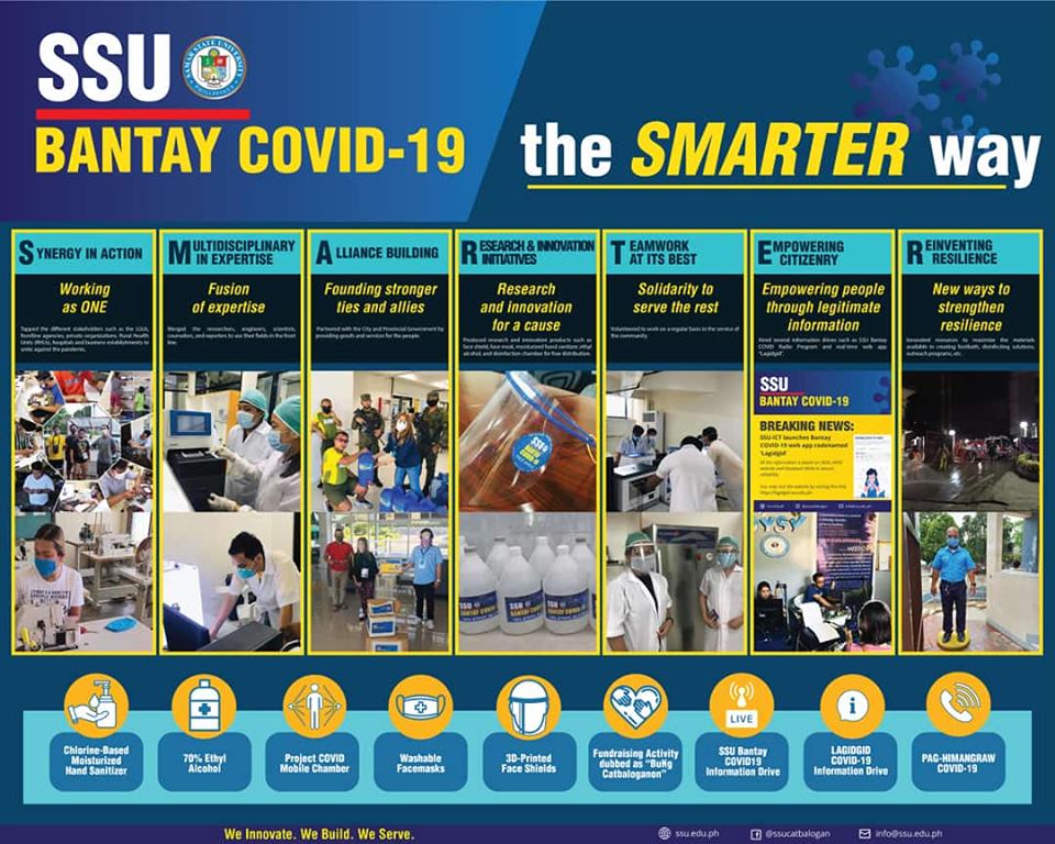 Samar State University (SSU) combats COVID-19 pandemic the SMARTER way! S-ynergy in Action M-ultidisciplinary in Expertise A-lliance Building R-esearch and Innovation Initiatives T-eamwork at its Best E-mpowering Citizenry R-einventing Resilience Let’s beat COVID-19 the SMARTER way! #WeInnovateWeBuildWeServe